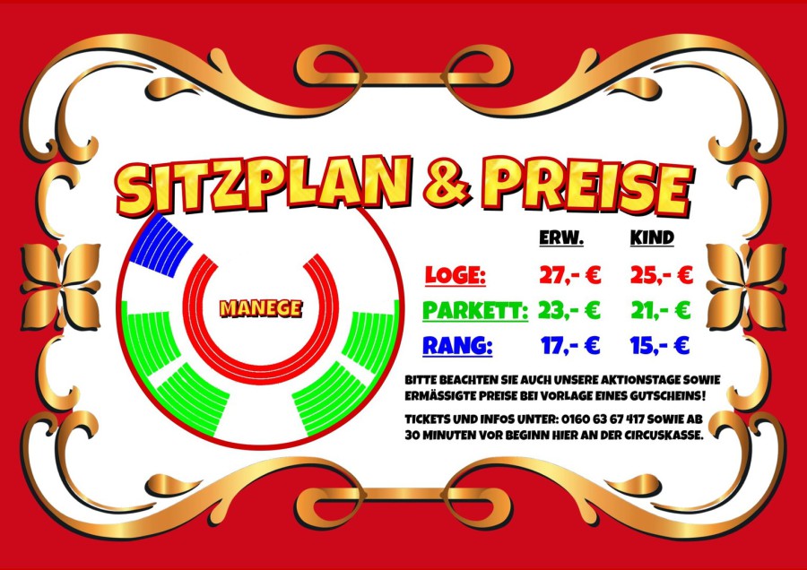 unseren Aushängen an der Circuskasse oder erfragen diese telefonisch.