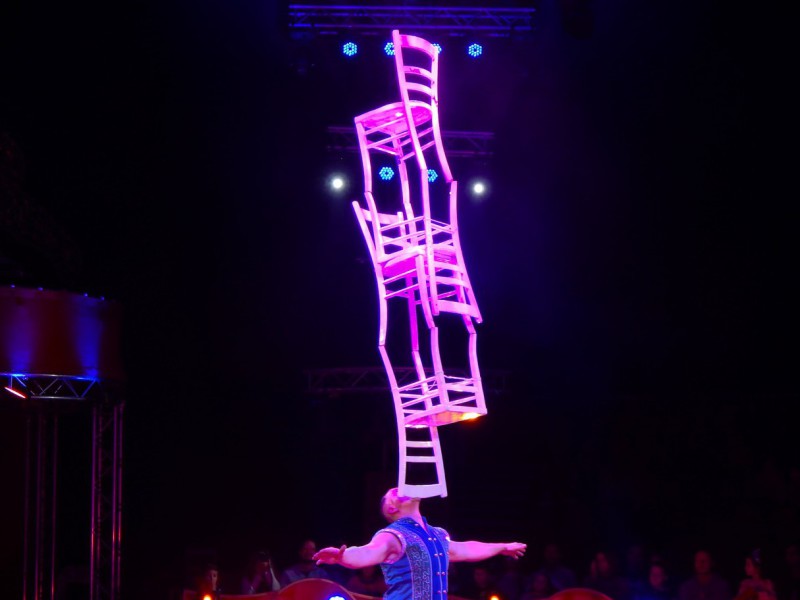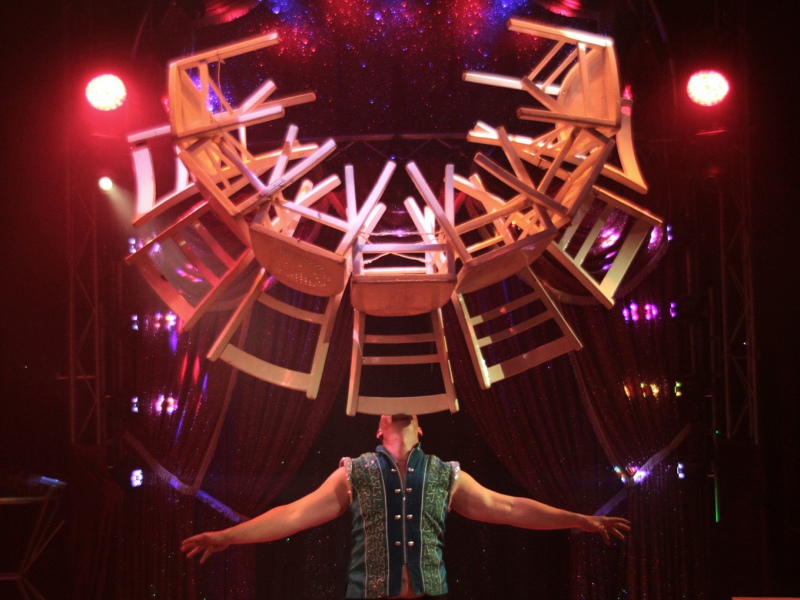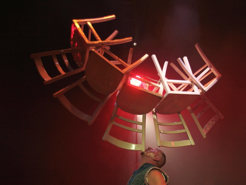 Mit viel Kraft und Geschick schafft er es, bis zu sieben Stühle frei auf seiner Kinnspitze zu balancieren. Eine artistische Meisterleistung in höchster Vollendung!